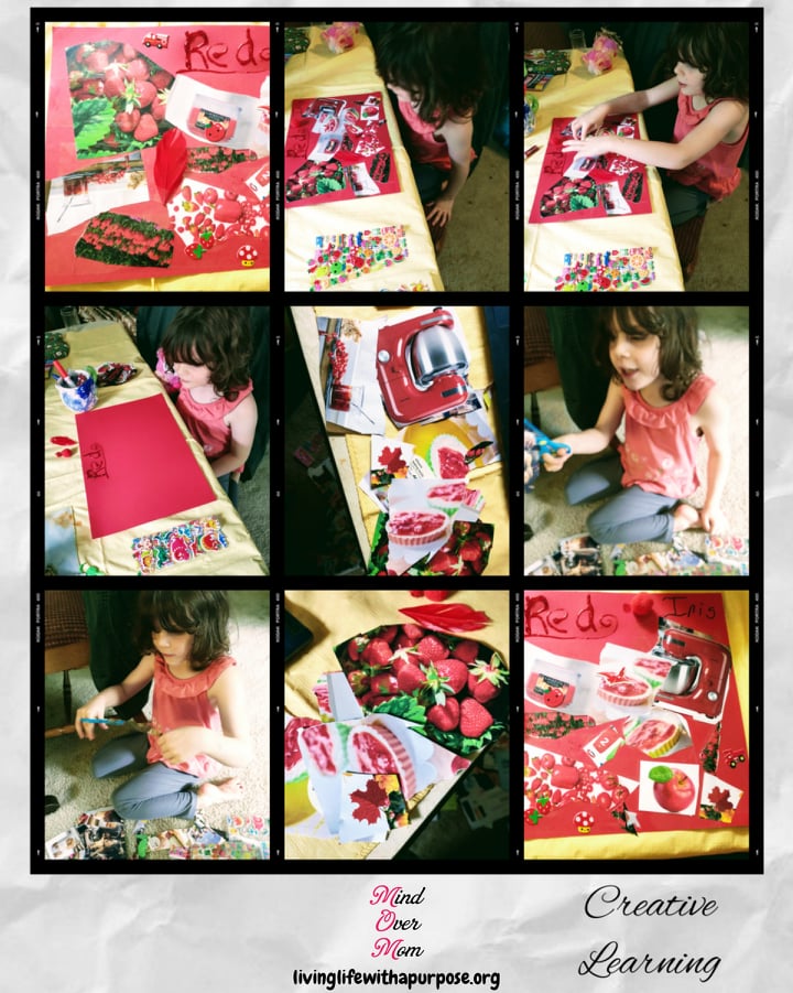 We went through various magazines and she pointed out different items that were that color. We pulled out those pages to make it easier to cut. (I even cut the pages in half at times.)
